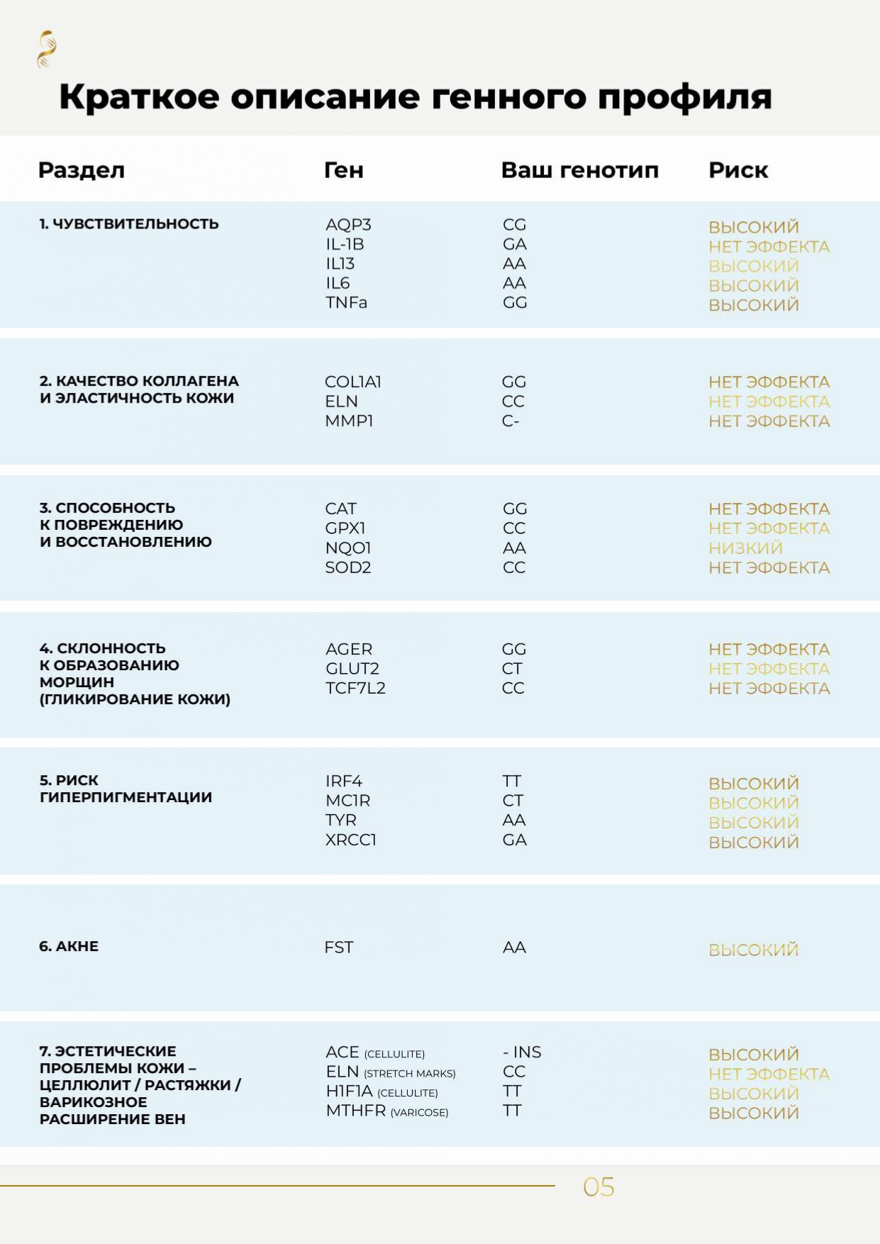В заключении будет информация о продуктах, которые стоит избегать или, наоборот, включить в рацион. По результатам ДНК-исследования рекомендовано проконсультироваться с эндокринологом или диетологом.