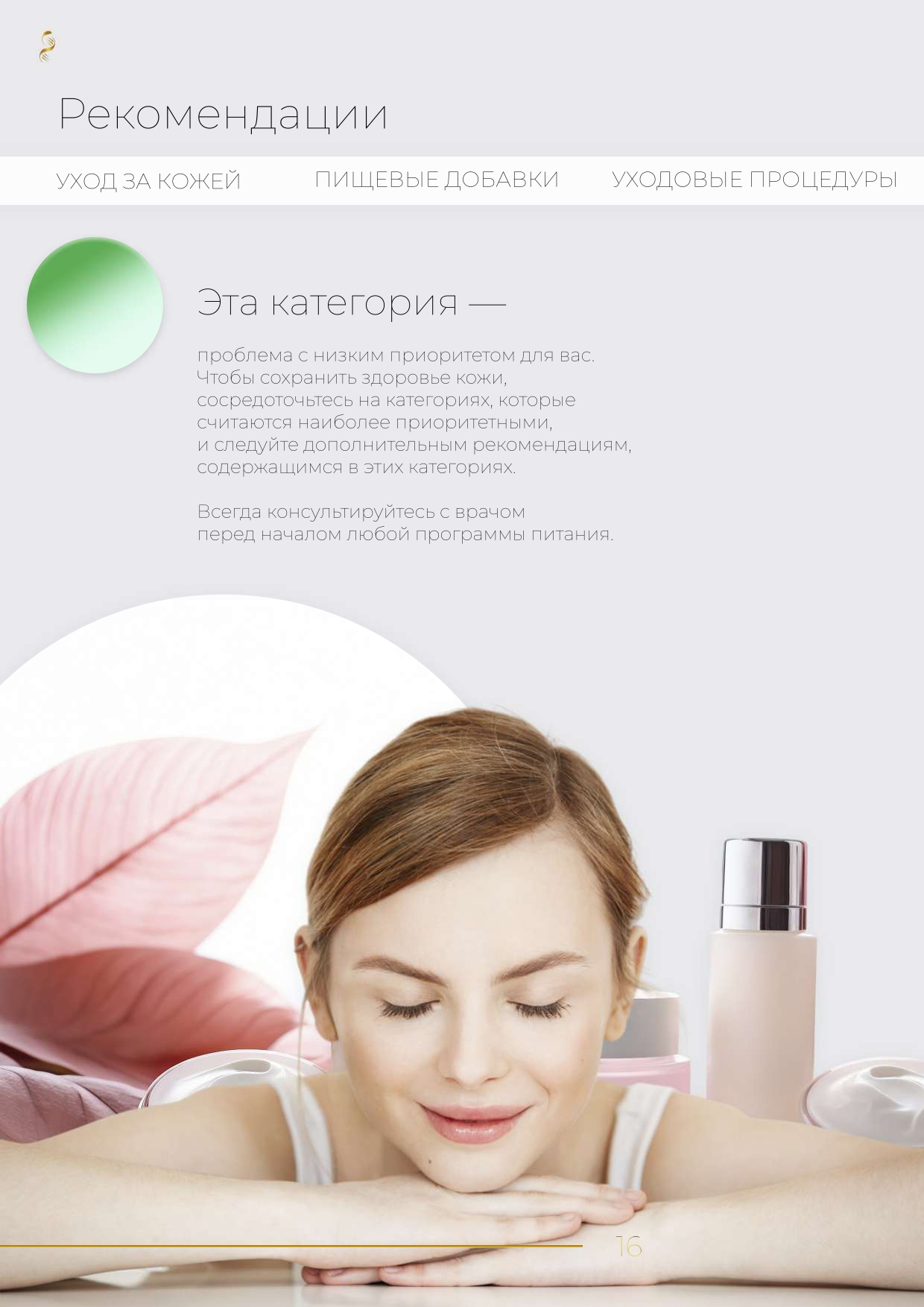 Индивидуальный генетический профиль красоты — это понятный отчет с графиками и диаграммой «Ваша стратегия по уходу за кожей», где наглядно показаны зоны высокого, среднего и низкого генетического риска. Используйте эти данные, чтобы адаптировать свой ежедневный уход и сосредоточиться на том, что действительно важно.